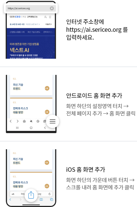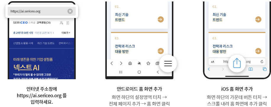 인터넷 주소창에 https://ai.sericeo.org를 입력하세요. [바로가기] 설치해 두시면 편리합니다.